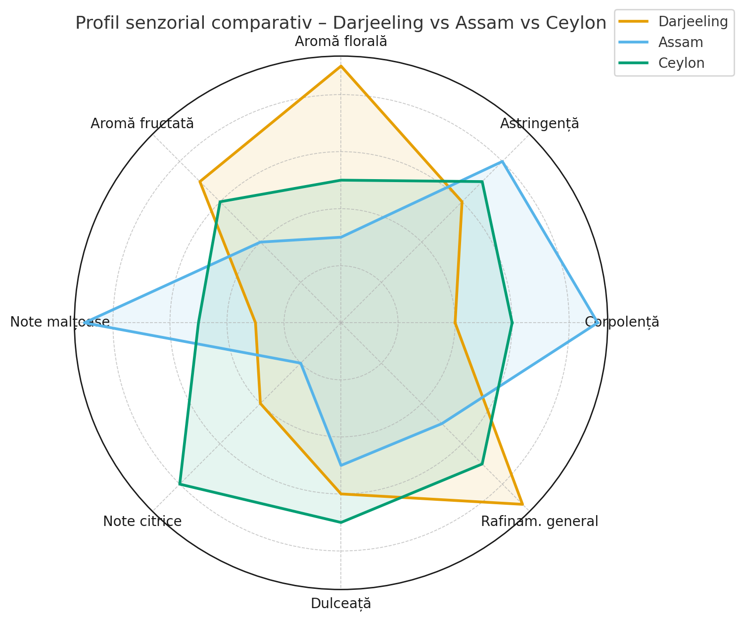 | Corpolență și intensitate | Ușor spre mediu, cu aromă rafinată | Foarte corpolent, intens, cu impact puternic | Mediu, mai puternic decât Darjeeling, dar mai blând decât Assam |