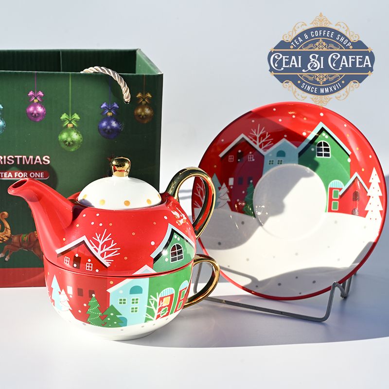 Tea For One, ceainic cu cesca din portelan pictat cu tema Happy Christams si decorat cu elemente aurii. Volumul ceainicului este de 380ml. Ambalat in cutie de carton cu print de Craciun, si protectie din burete.