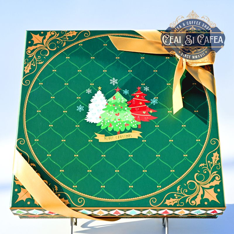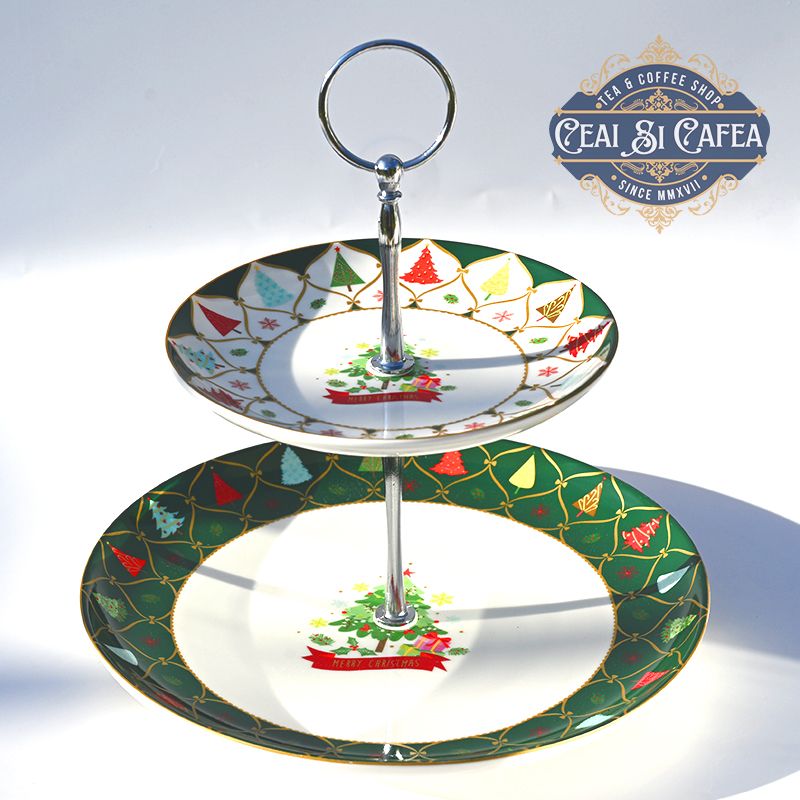 Platou 2 etaje, din portelan, cu model Brăduți de Crăciun, ambalat in cutie eleganta de carton, cu print Brăduți de Crăciun si fundiță. Contine accesorii si schita de montare.
