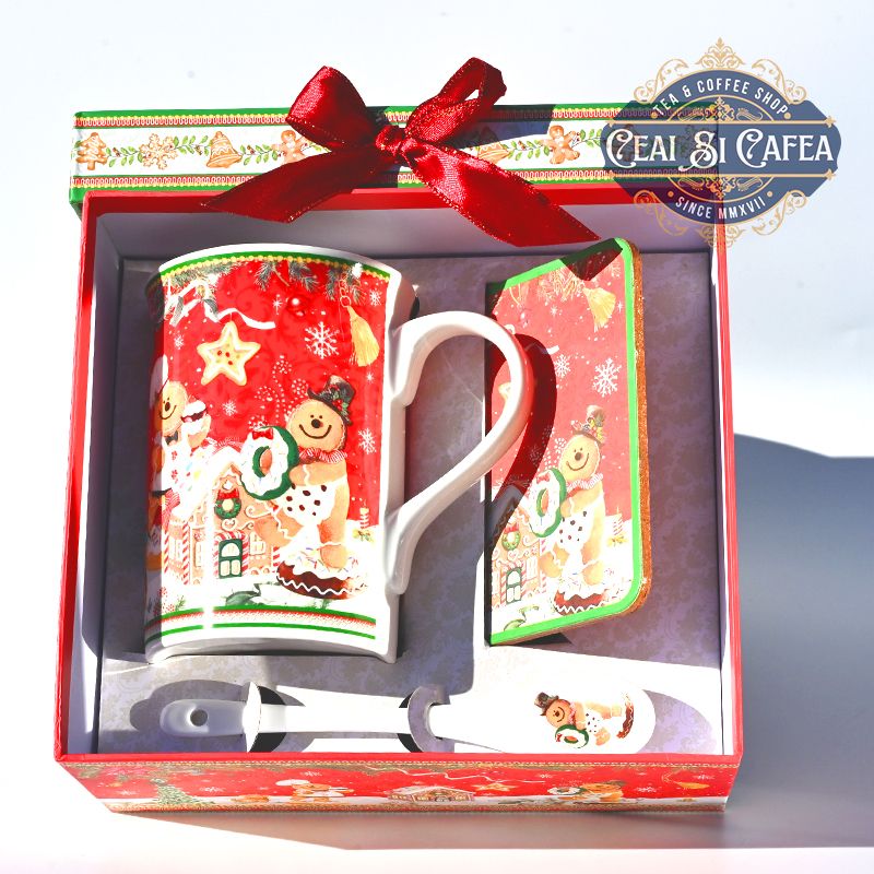 Cana si lingurita de portelan, cu coaster, motiv Căsuța Omului de Turtă Dulce. Volum 250 ml. Ambalate elegant in cutie de carton, cu tema de Crăciun viu colorată.