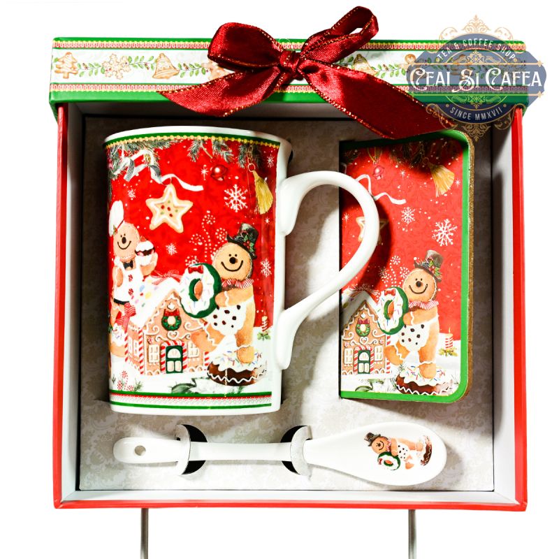 Zâmbete dulci și clinchet de clopoței. Setul „Gingerbread Man” e mai mult decât o cană — e o poveste de iarnă spusă la fiecare înghițitură de ceai. Cana si lingurita de portelan, cu coaster, motiv Căsuța Omului de Turtă Dulce. Volum 250 ml. Ambalate elegant in cutie de carton, cu tema de Crăciun viu colorată.