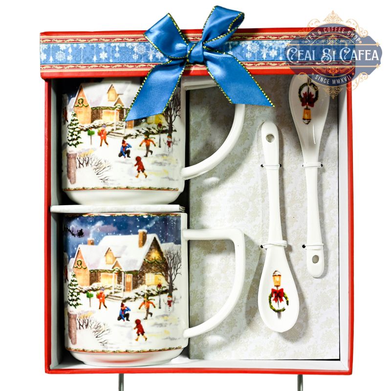 Conține două căni din porțelan fin (250 ml) și două lingurițe asortate, ambalate într-o cutie rectangulară elegantă, decorată în același motiv de iarnă.